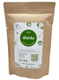 Matcha is a popular ground green tea that is known for its lightly grassy flavor and is touted for its many health benefits. It has a higher caffeine content than standard green tea (but less than coffee) because the whole leaf is consumed in the process of making matcha. You can serve it on its own hot or cold, or you can also make it into a delicious latte!